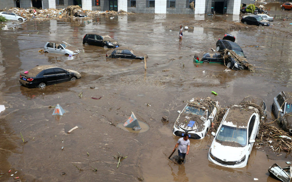 This photo taken on July 14, 2017 shows submerged cars in a flooded street in Yongji, a county under the administration of the city of Jilin in northeast China’s Jilin province. Heavy rains caused flooding that left 18 people dead and another 18 missing around Jilin, with more than 110,000 evacuated when flooding hit the city on July 13 and 14. / AFP PHOTO / STR / China OUT