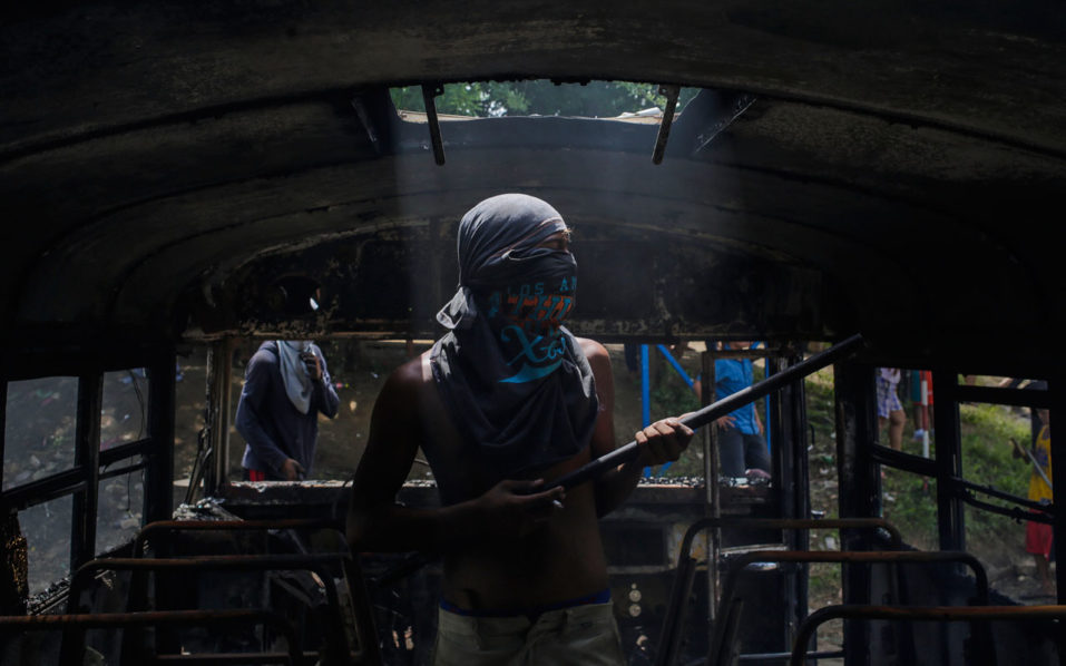 A demonstrator stands inside a bus set alight during a day-long national strike held to mark two months of violent chaos under President Daniel Ortega, in Tipitapa, about 25 km from Managua on June 14, 2018. A national strike got underway Thursday in Nicaragua to protest the government’s deadly crackdown on a two-month long popular uprising against Ortega, hours after the Church moved towards rekindling talks to calm the crisis rights groups say has killed at least 157 people. / AFP PHOTO / Inti OCON