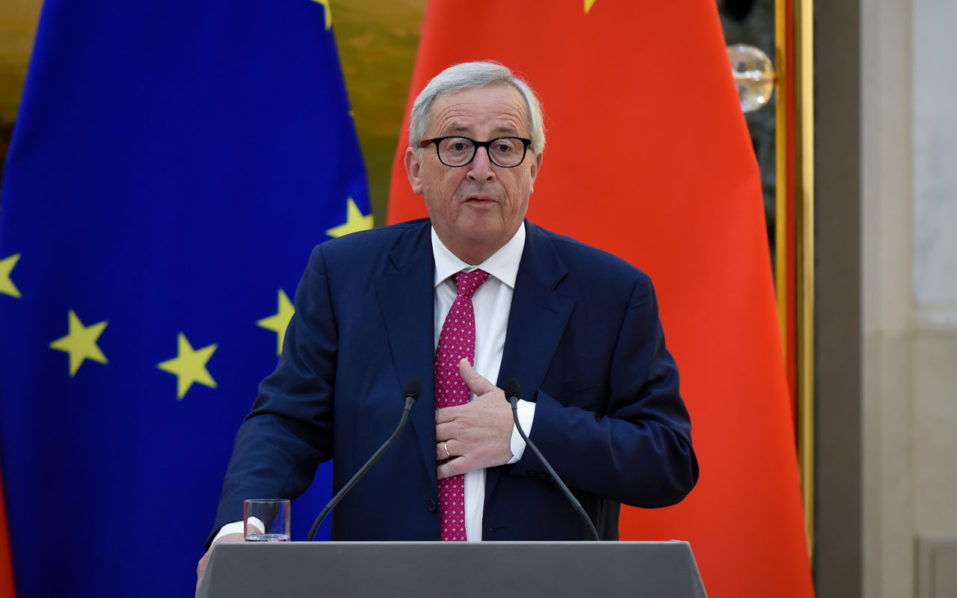 President of the European Commission Jean-Claude Juncker speaks during a press conference at the Great Hall of the People in Beijing on July 16, 2018. / AFP PHOTO / WANG ZHAO