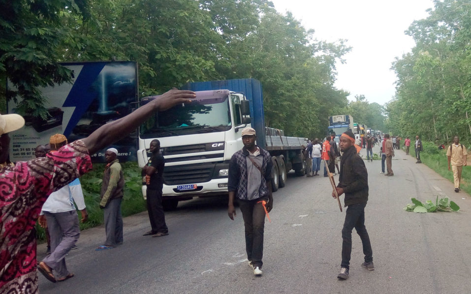 Several hundred ex-rebels block access to Bouake, their former stronghold in central Ivory Coast, on May 8, 2017 to press pay demands after a mutiny in January that led to a deal. / AFP PHOTO / STR