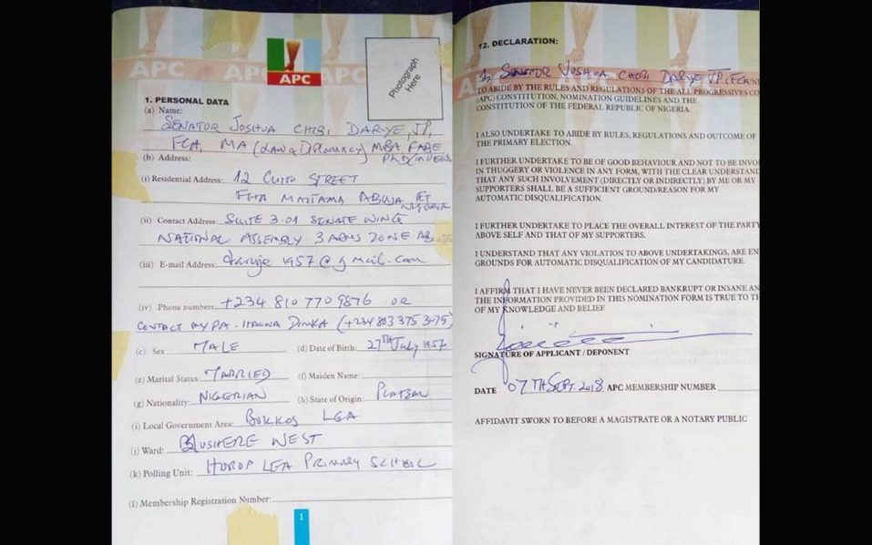According to reports, Joshua Dariye’s personal assistant Itauna Dinka obtained the nomination form for his principal’s re-election on Friday, September 7.