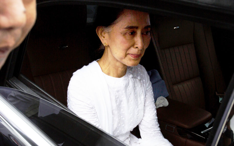 Myanmar’s State Counselor Aung San Suu Kyi leaves after attending the funeral service for the National League for Democracy (NLD) party’s former chairman Aung Shwe in Yangon on August 17, 2017. / AFP PHOTO / AUNG Kyaw Htet