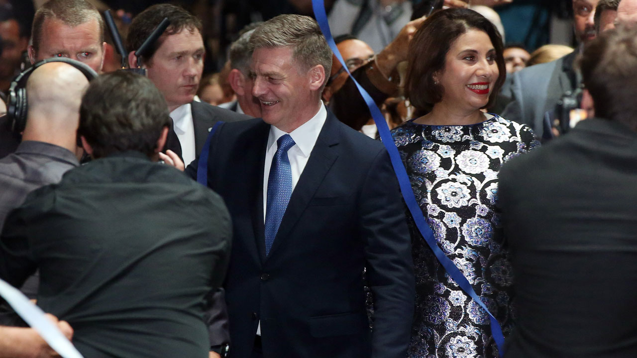Leader of the National Party Bill English (C) and his wife Mary (centre R) attend the party’s election event at SkyCity Convention Centre in Auckland on September 23, 2017. New Zealanders went to the polls on September 23 to elect a new parliament. MICHAEL BRADLEY / AFP