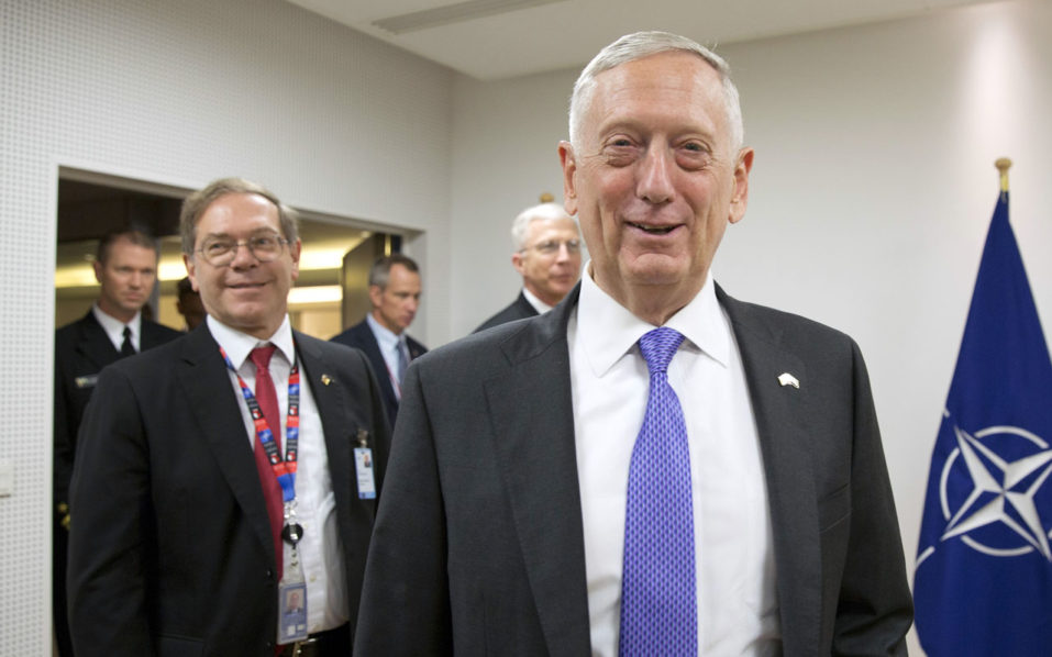 U.S. Secretary for Defense Jim Mattis (R) arrives prior to a meeting at NATO headquarters in Brussels on June 29, 2017. NATO defense ministers meet to discuss, among other issues, the situation in Afghanistan and defense spending. / AFP PHOTO / POOL / Virginia Mayo