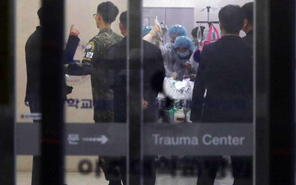Footage showed the badly injured man being pulled to safety by two South Korean soldiers who crawled to reach him just south of the demarcation line.