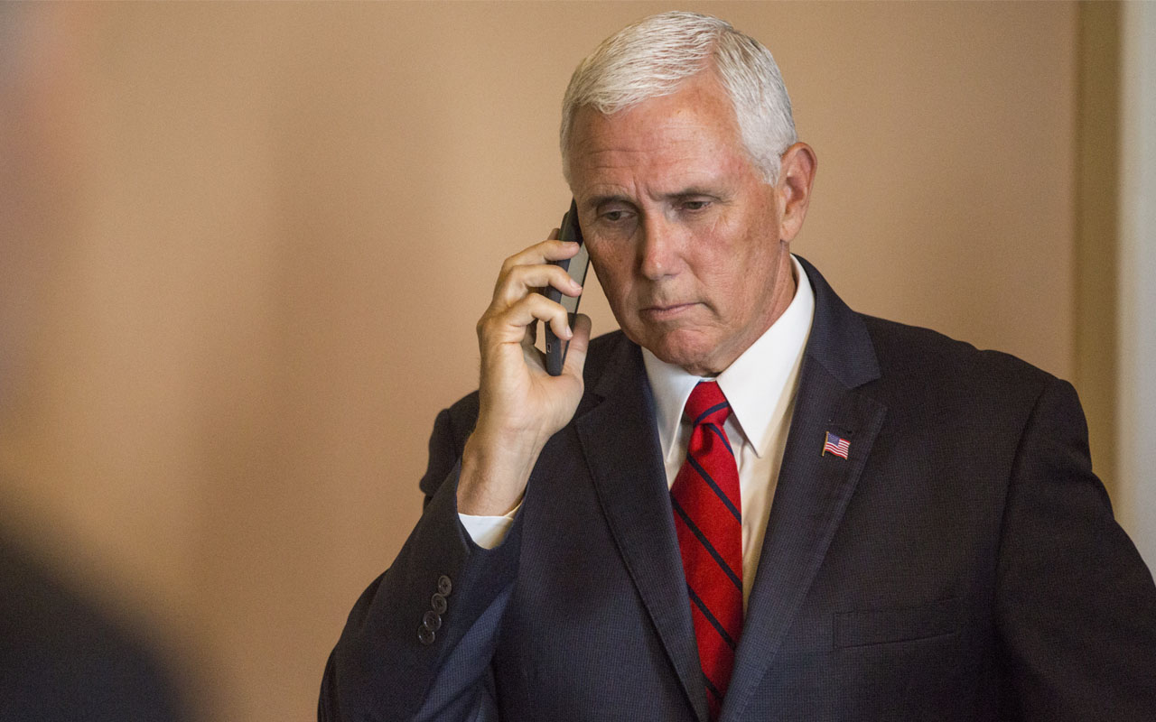 WASHINGTON, DC - SEPTEMBER 05: U.S. Vice President Mike Pence takes a phone call on Capitol Hill following a mock swear-in ceremony for U.S. Sen. John Kyl (R-AZ) on September 5, 2018 in Washington, DC. The former senator Kyl was tapped by Arizona Gov. Doug Ducey to replace the late Sen. John McCain. Zach Gibson/Getty Images/AFP