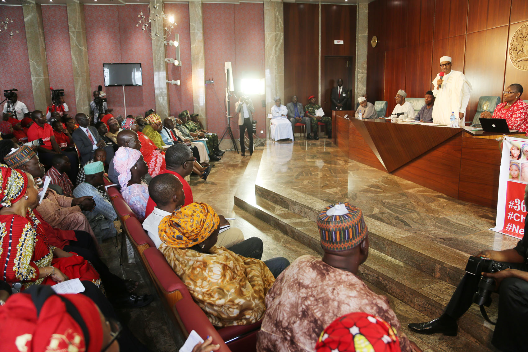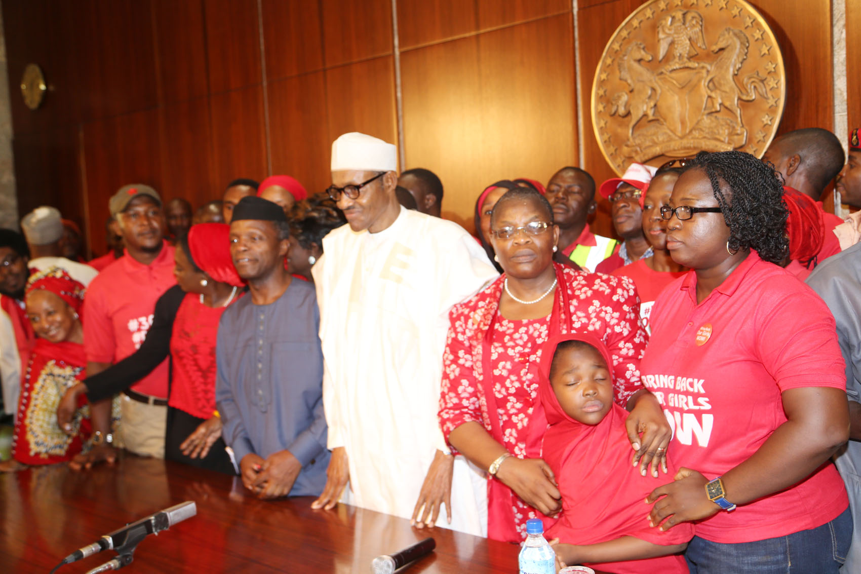 Coordinator Bring Back Our Girls and Former Education Minister Oby Ezekwesili, President Muhammadu Buhari, Vice President Yemi Osibajo at the Presidential Villa On Wednesday 8th July 2015 PHOTO:Philip OjisuaPresident Muhammadu Buhari (far right) addressing members of #BringBackOurGirls at the Presidential Villa, Abuja On Wednesday 8th July 2015 PHOTO: Philip Ojisua