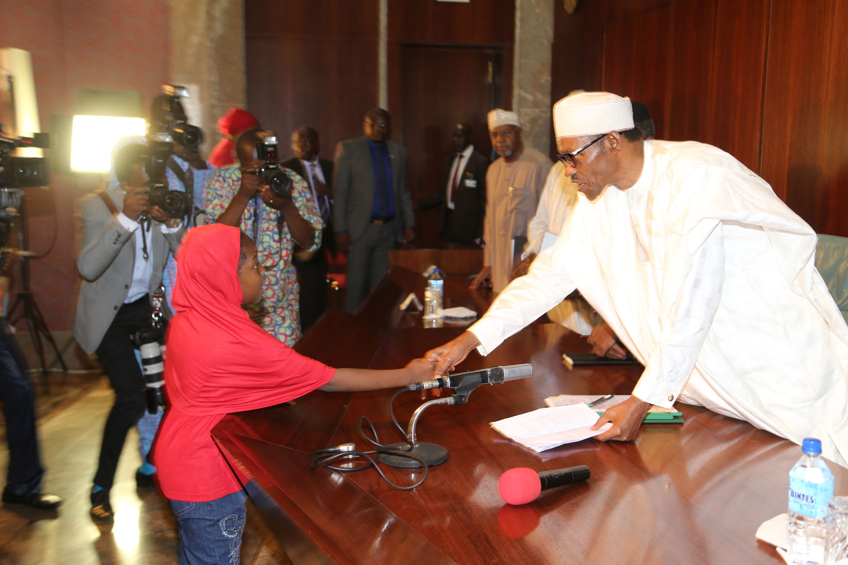 President Muhammadu Buhari Receiving a message from the representative of the Chibok girls Hauwa Abubakar at the Presidential Villa On Wednesday 8th July 2015 PHOTO: Philip Ojisua