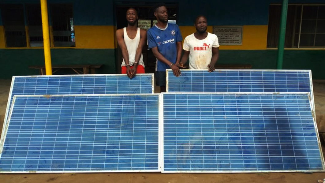 The three suspects, Kehinde Yahaya, 36; Akeem Adetona, 36; and Taofeek Olalere, 36 were arrested following a distress call made to the Divisional Police Officer (DPO) Atan Ota division, Abiodun Salau, a Superintendent of Police at about 12:00a.m. midnight by the vigilance group men at Onigbogbo Phase 2 that a group of thieves have burgled into the MTN mast and they were carting away 12 solar power panels valued at about N14 million.