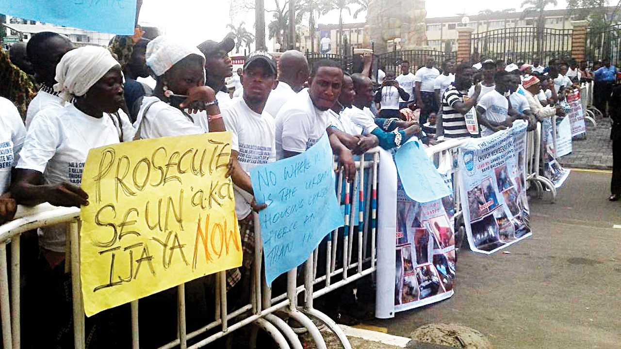 Hundred of Ori-Oke Alala residents in Makoko area of Yaba Local Council, yesterday staged a peaceful protest to the Lagos House, Alausa, Ikeja, demanding justice over the invasion of their community on May 10, by policemen, led by the chairman, task force on land grabbers, Mr. Jide Bakare.