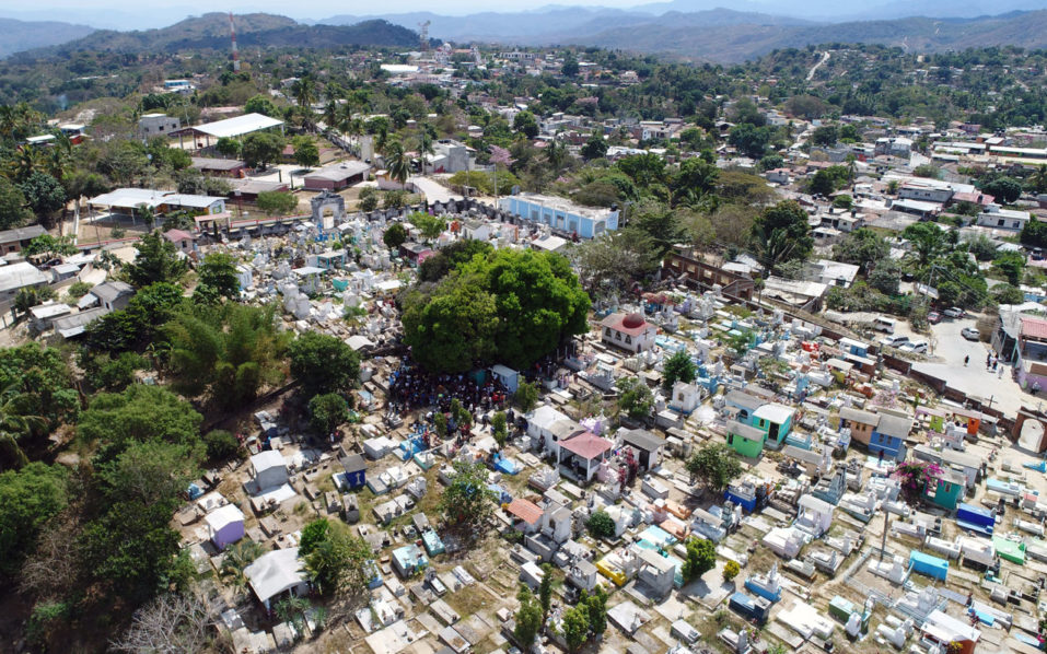 Aerial view of the cemetery in Santiago Jamiltepec during the funeral of one of thirteen people killed when a military helicopter fell on a van in that town in Oaxaca state, Mexico, on February 18, 2018. A 7.2-magnitude earthquake rattled Mexico on Friday, causing little damage but triggering a tragedy when a minister’s helicopter crash-landed on the way to the epicenter, Oaxaca, killing thirteen people, including three children, on the ground. / AFP PHOTO / MARIO VAZQUEZ