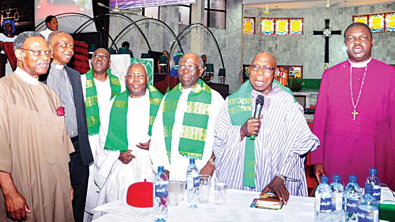 Former Commonwealth Secretary General, Chief Emeka Anyaoku (left); Ven Luyi Akinwande; Vice President, Torchbearers Society, Ayo Rotibi; past president, Hon Justice Samuel Ilori; Chief Olusegun Osunkeye; past President of Nigeria/Guest Speaker, Chief Olusegun Obasanjo and the Lord Bishop Diocese of Lagos West, Rt Revd Dr, James Olusola Odedeji during a lecture, “God in my life series” sponsored by Torchbearers Society at Archbishop Vining memorial Church Cathedral in Lagos…yesterday PHOTO: FEMI ADEBESIN-KUTI