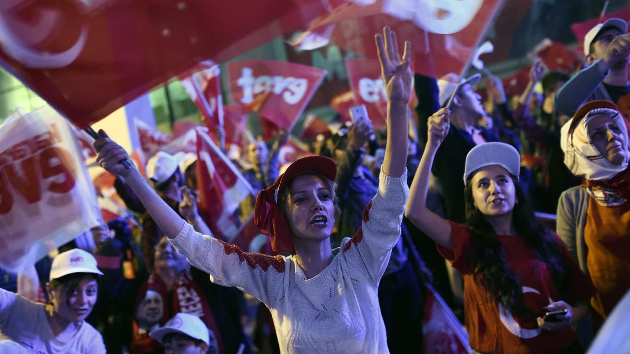 A supporter of Turkey’s president chants slogans and flashes a four finger sign called “the rabia sign” among Turkish national flags and flags reading “yes” during a rally near the headquarters of the conservative Justice and Development Party (AKP) on April 16, 2017 in Istanbul after the initial results of a nationwide referendum that will determine Turkey’s future destiny. The “Yes” campaign to give Turkish President expanded powers was just ahead in a tightly-contested referendum but the ‘No’ was closing the gap, according to initial results. OZAN KOSE / AFP