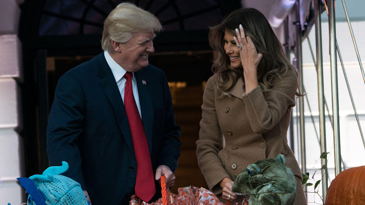 US President Donald Trump and First Lady Melania Trump hand out candy to children during a Halloween event at the White House in Washington, DC, on October 30, 2017. NICHOLAS KAMM / AFP