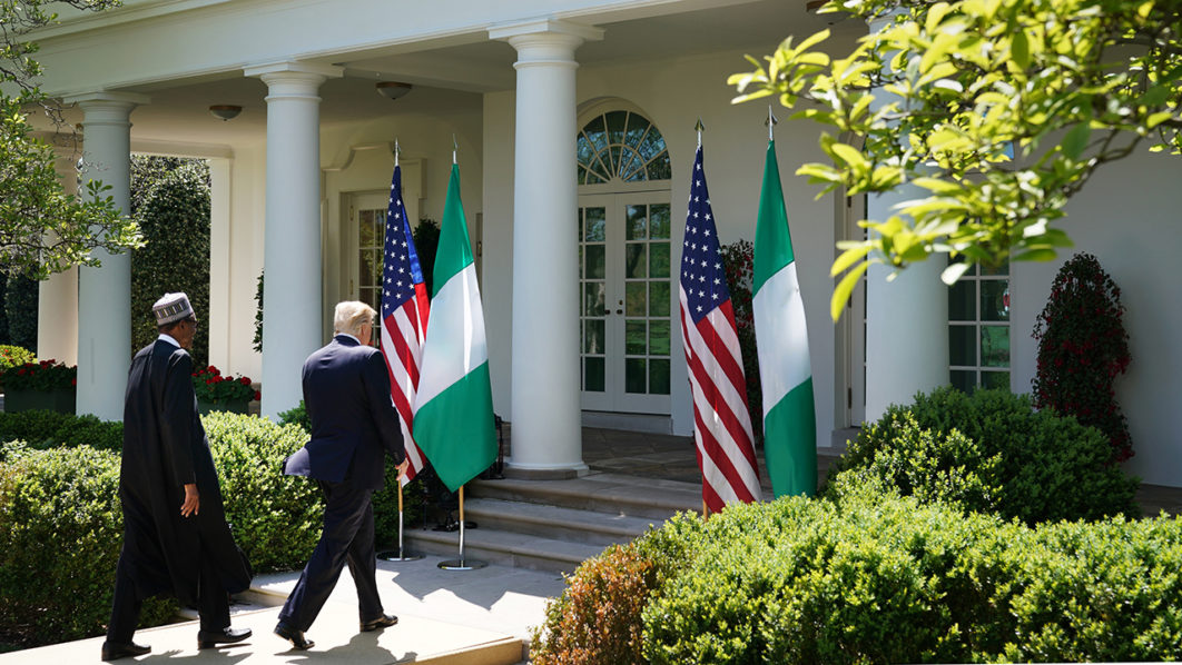 US President Donald Trump and Nigeria’s President Muhammadu Buhari make their way from a joint press conference in the Rose Garden of the White House on April 30, 2018 in Washington, DC. / AFP PHOTO / Mandel NGAN