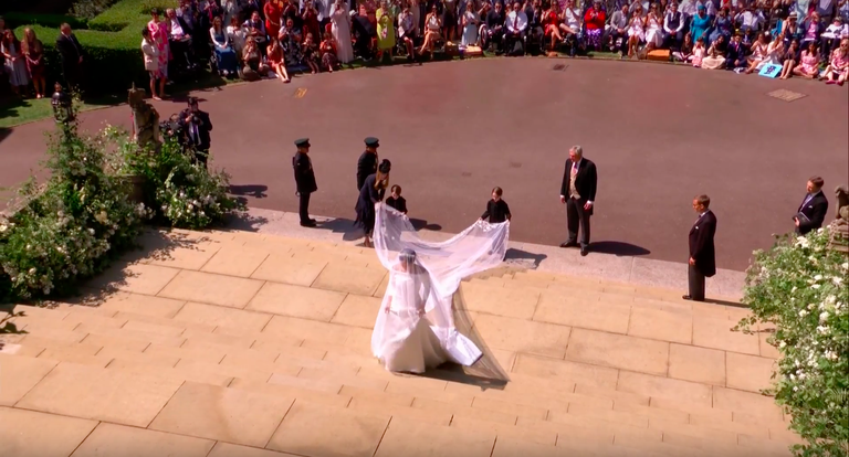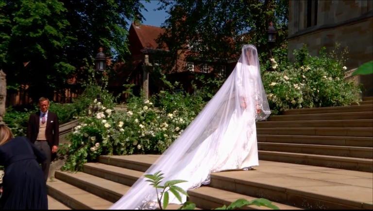 She is wearing a classy and elegant dress made by Givenchy’s creative director Claire Waight Keller. The unique wedding dress’s veil is longer than her hemline. She also graces her hair with Queen Mary’s filigree Tiara.