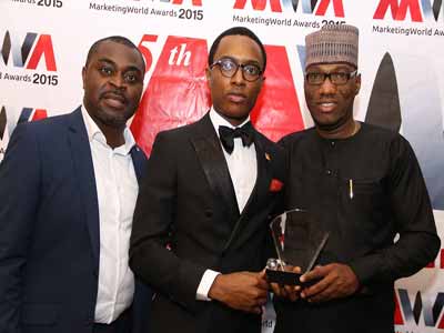 Publisher, Marketing World Magazine, Akin Naphtal (left); Group Head, Corporate Communications, BUA Group, O'tega Ogra; and Special Assistant to the Executive Director, BUA Group, Gbolly Oluwasegun, at the fifth Edition of Marketing World Awards 2015, where BUA Cement won the Cement Brand of the Year Award.