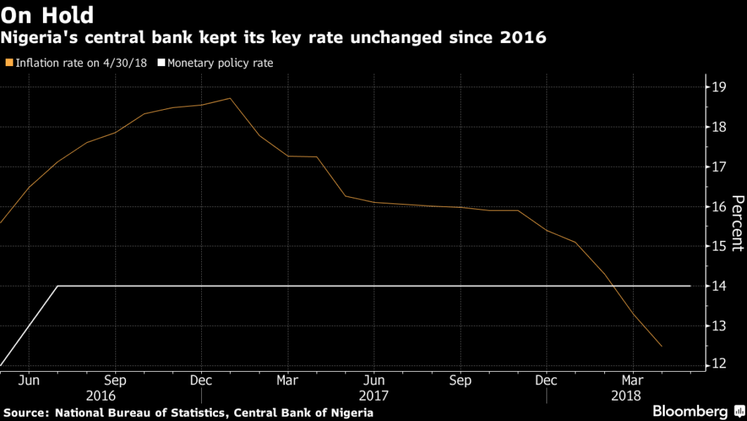 The central bank has held the rate since July 2016 in a bid to bring down inflation and prop up the naira. Price growth slowed to a two-year low of 12.5 percent, still above the authorities’ target band of 6 percent to 9 percent.