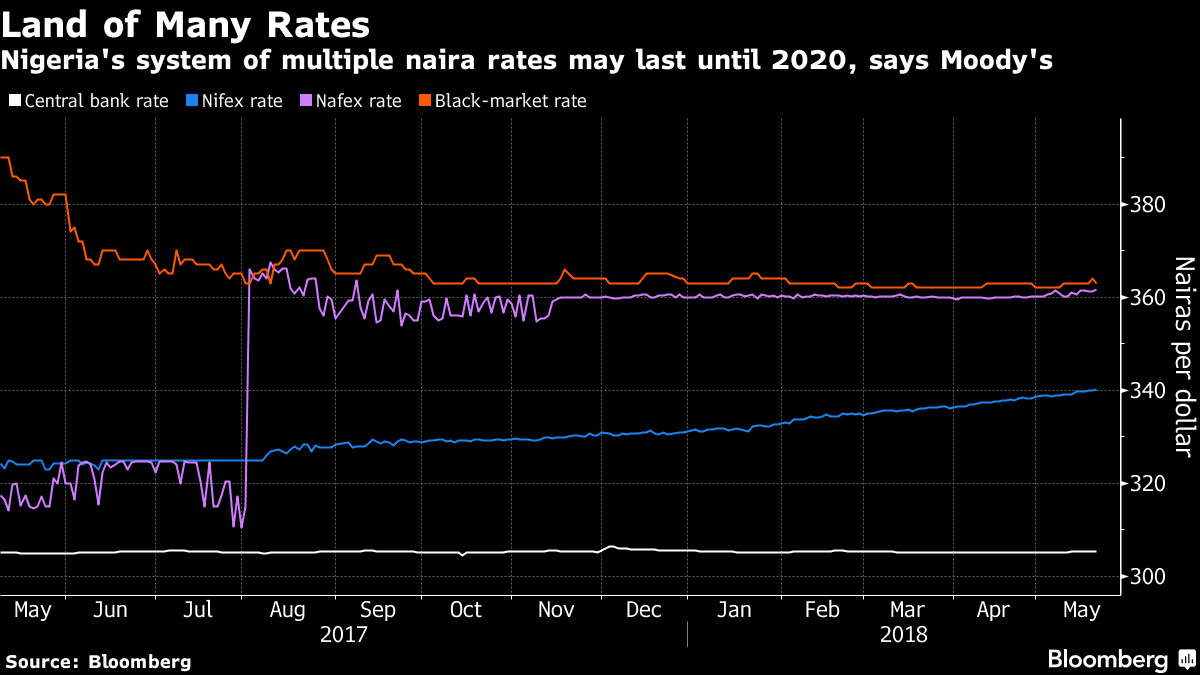 While the International Monetary Fund has said the existence of multiple exchange rates creates distortions in the economy, Nigeria will probably maintain several naira rates until at least 2020, according to Moody’s Investors Service. This is because merging them could force the government to weaken the currency and raise fuel prices, which would accelerate inflation.