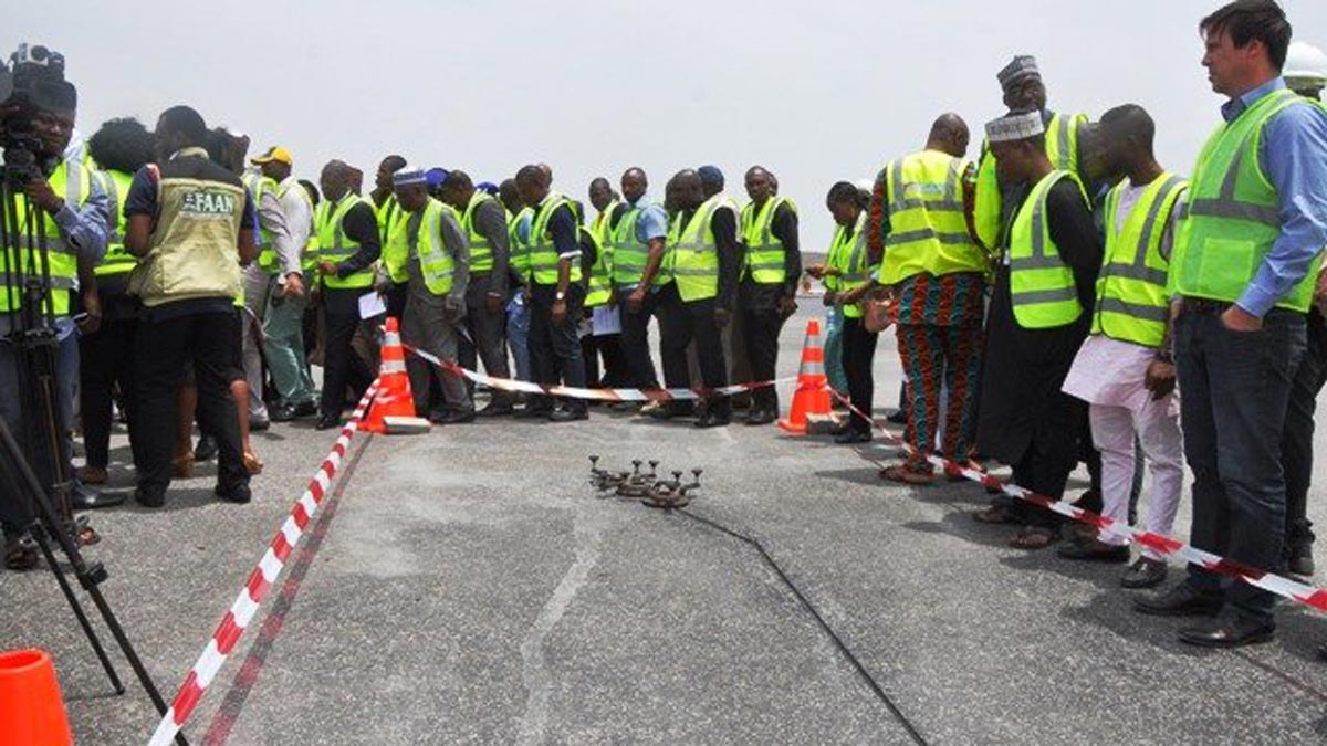 Nigeria's minister of aviation Hadi Sirika and his information and culture counterpart, Lai Mohammed, inspect the reconstruction of Abuja Airport runway on Thursday, March 30, 2017 in aviation wear.