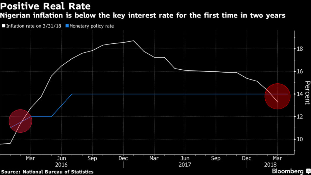 Nigeria’s central bank left its main lending rate at a record high of 14 percent when policy makers met April 4 to continue fighting inflation that’s been above the target range of 6 percent to 9 percent for more than 2 1/2 years. Governor Godwin Emefiele said the bank would consider cutting rates from where they have been since July 2016 when inflation slows closer to single digits.