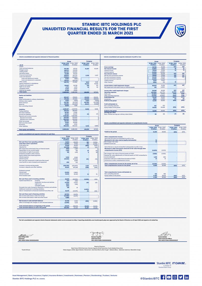 Stanbic IBTC Holdings PLC unaudited financial results for the first quarter ended 31 March 2021 By : Editor Date: 26 April 2021 4:11pm WAT Share : Stanbic IBTC Related News Banker charges youths to prioritise opportunities for growth Banker charges youths to prioritise opportunities for growth Zest to enhance financial services of e-commerce businesses Tags: Stanbic IBTC Holdings Plc