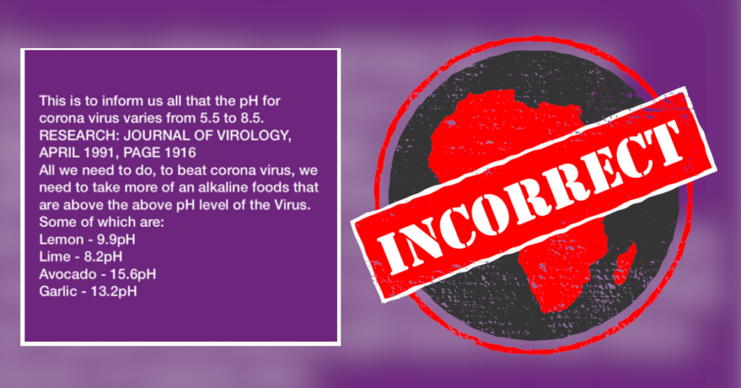 Tanimola Akande, professor of public health at the University of Ilorin in western Nigeria, told Africa Check that the new coronavirus “does not have its own pH”. He said it survived well in an environment with a pH of about 6 and was unable to survive at a pH of 8 and above.