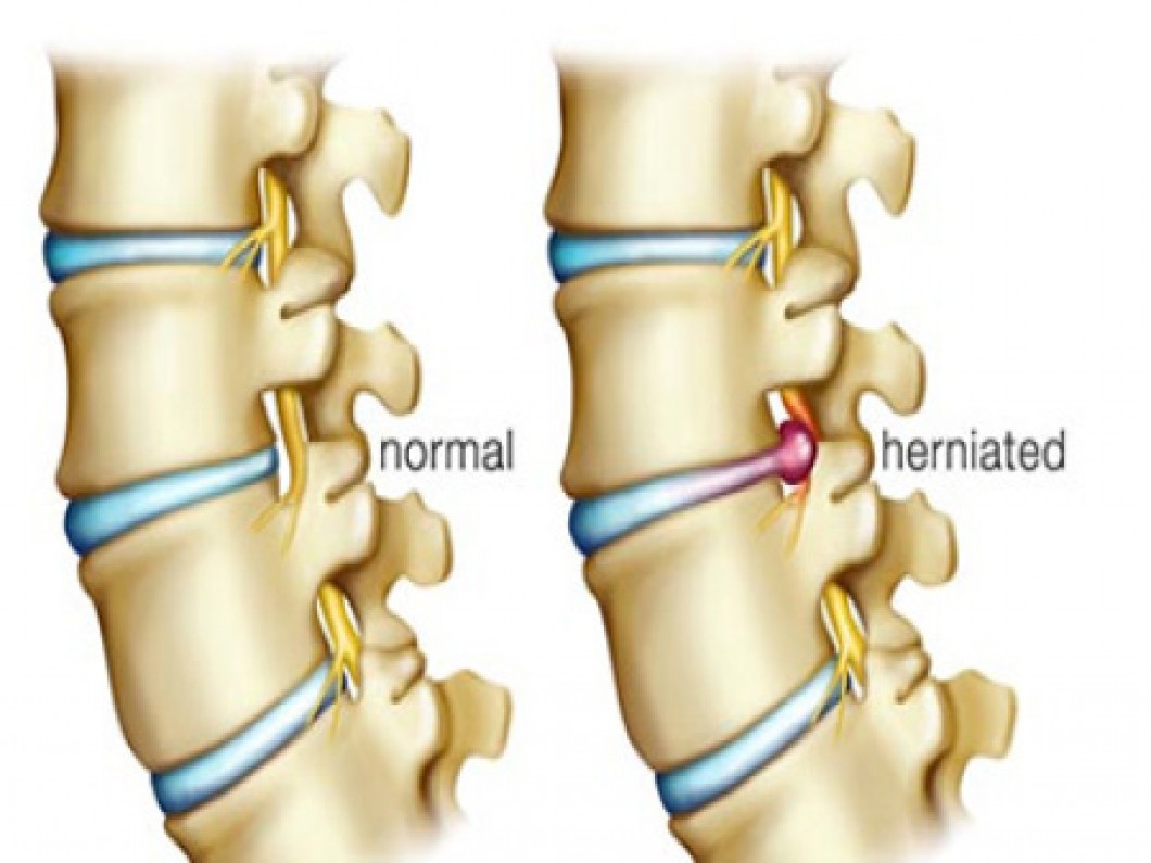 There are discs that act as a cushion for the spines vertebrae, when one of this discs becomes weak or even ruptures, this is called herniated disc and causes back pain.