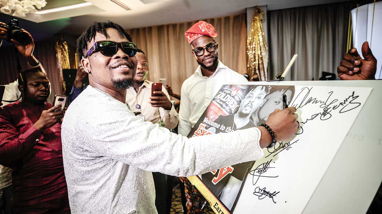 At last, to the sound of drums, tradirtional chants by the cuktural troupe and fireworks, music sensation, Olamide was unveiled as the new brand ambassador for Goldberg Lager. It was cheers all the way as the hitmaker emerged from back stage to the delight of guests, who had waited for the hour to come.