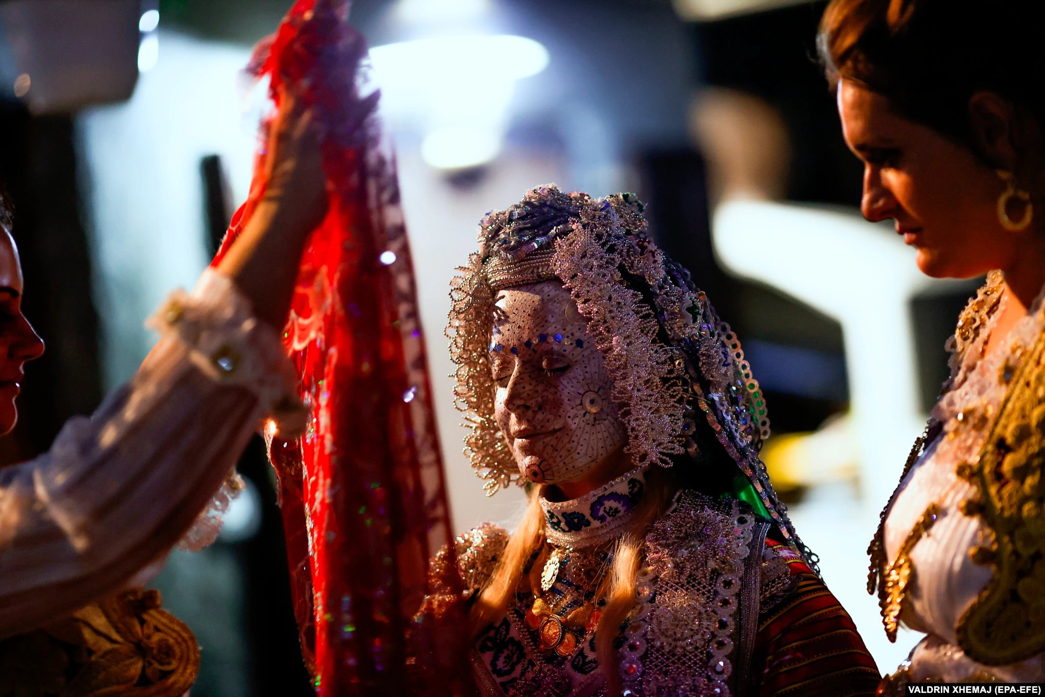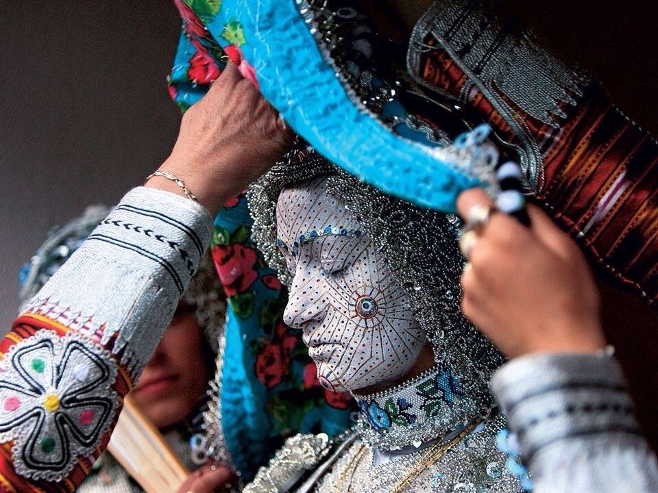 A bride is dressed from head to toe in traditional attire, and her face is painted white with ornate crimson, blue, gold and silver dots and sprays, while an older woman paints the face of the bride as loud drum music plays during the ceremonial show.
