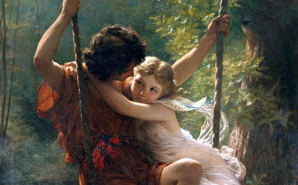 In his realism painting, Pierre-Auguste Cot draws a couple adorned in robes that shows their deepest feelings for each other. The use of the colour red by the painter suggests the burning desires of the male figure for his partner. For the female figure in the painting, the use of white which is worn by the girl is symbolic to mean purity. This work  further captures a scenario of a rustic love in springtime. The work which was formed in 1873 zooms on the playfulness of two people in love as they lovingly embrace each other on a swing in the middle of the forest.