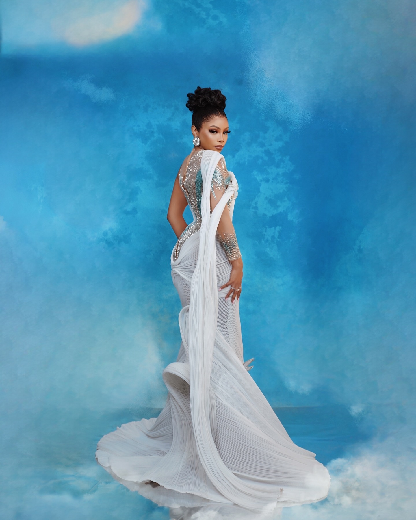 One of Bonang’s standout looks was a custom white floral and spiral dress by Emagine by Bukola, accented with blue to capture the essence of the wind and the butterfly’s gentle grace.