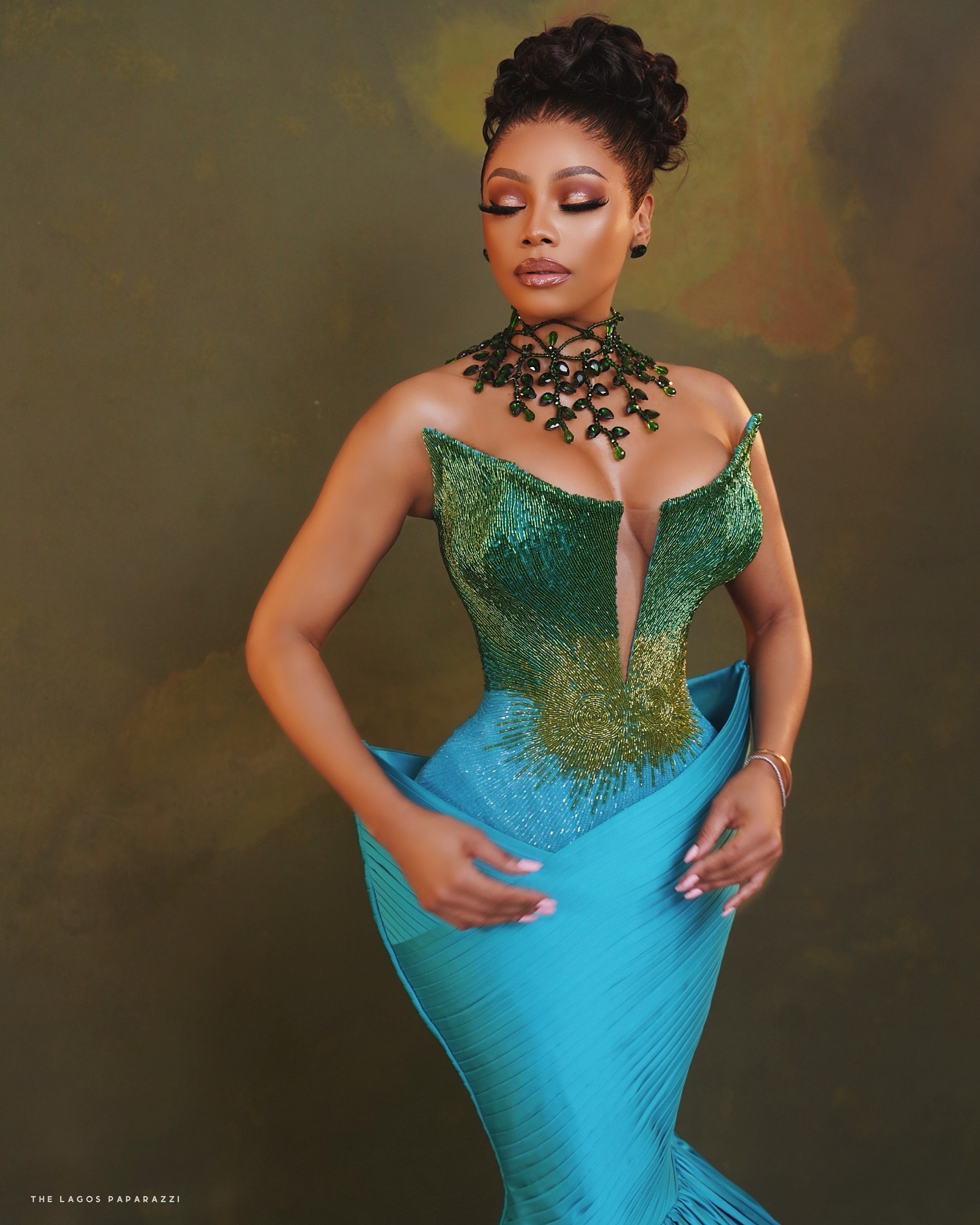 Veekee James designed an outfit featuring a blend of blue and green hues. Completed within a week, according to the designer, the masterpiece features a corseted green tube bodice with a sweetheart neckline, complemented by a structured blue bottom with tiny pleats that flare elegantly.