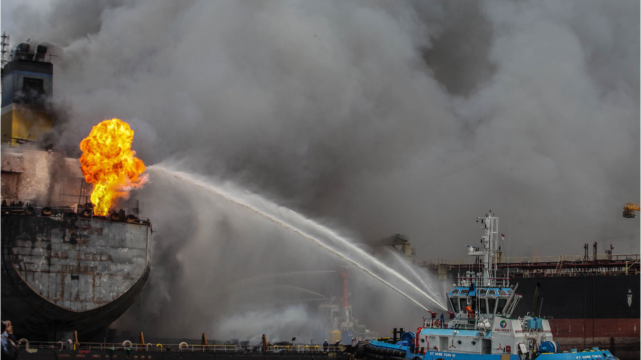 Firefighters on board another boat battled to put out the inferno on the Indonesia flagged vessel that was docked for repairs at North Sumatra’s Belawan port.