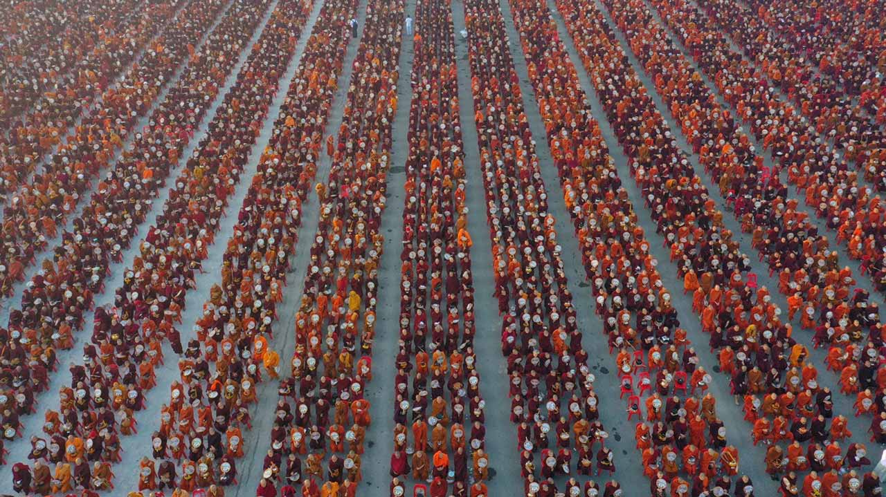 Thirty-thousand monks assembled in the early morning chill in Myanmar on Sunday for a spectacular alms-giving event, partly organised by a controversial mega-temple under scrutiny across the border in Thailand.