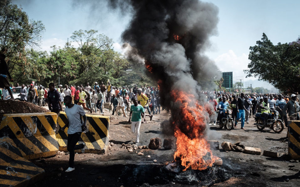 In Odinga’s western stronghold of Kisumu, thousands of protesters took to the street, blocking roads, setting heaps of tyres alight and engaging in running battles with police.