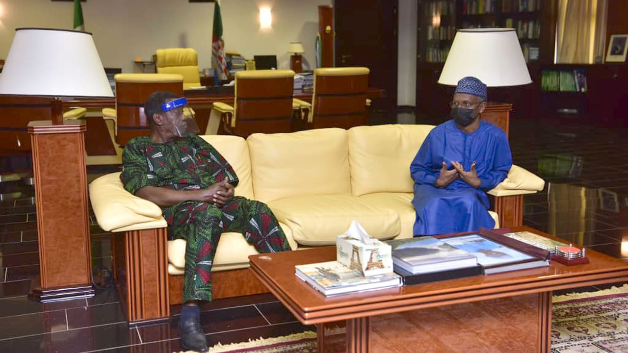 Kaduna State Governor Nasir El-Rufai (right); General Overseer of the Redeemed Christian Church of God (RCCG), Pastor Enoch Adeboye, during a courtesy visit by the cleric to Government House, Kaduna…yesterday.
