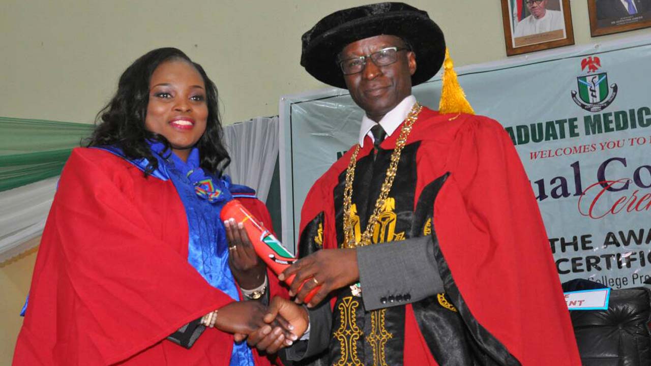 Dr. Damilola Akinsulire receiving the fellowship and Best Candidate in Principle and Practice of Public Health at the 2017 Postgraduate Medical College of Nigeria convocation in Lagos.