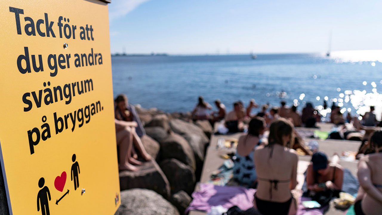 An information sign recommends people to keep social distance due to the COVID-19 pandemic, where people sunbathe and swim at a bathing jetty in Malmo, Sweden, on June 25, 2020.Swedish health officials said Tuesday that another 3,000 deaths from the novel coronavirus were likely in the country, known for its controversial softer approach to curbing the spread and much higher death toll than its neighbors. (REUTERS /Johan Nilsson/TT News Agency)