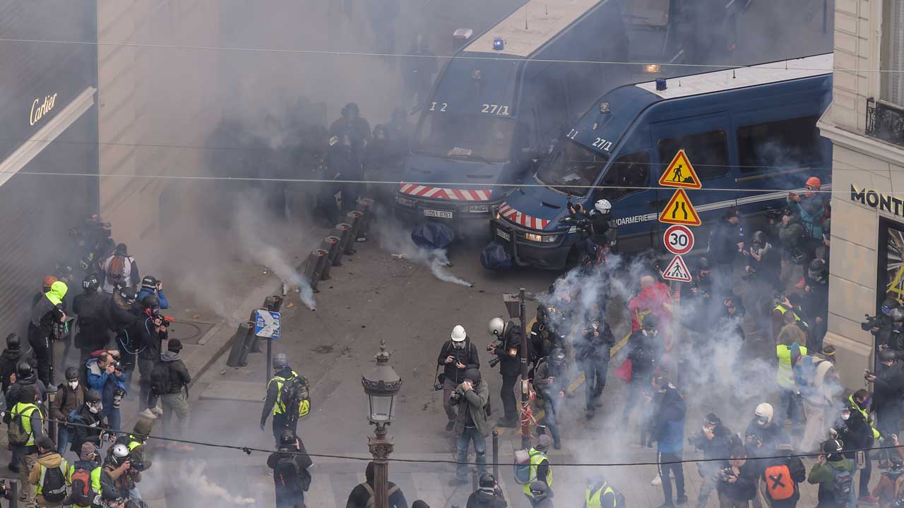 [FILE] Riot police members block protestor wearing “Yellow vests” (gilets jaunes) near the Champs Elysees avenue in Paris on December 8, 2018 during a mobilisation against rising costs of living they blame on high taxes. Paris was on high alert on December 8 with major security measures in place ahead of fresh “yellow vest” protests which authorities fear could turn violent for a second weekend in a row.Lucas BARIOULET / AFP