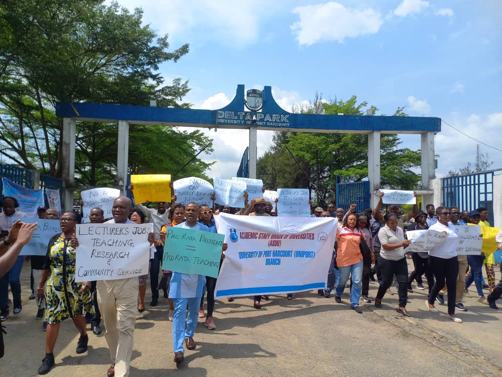 Lecturers of the University of Port Harcourt (Uniport), under the aegis of the Academic Staff Union(ASUU), have protested the half-salary payment by the Federal Government.