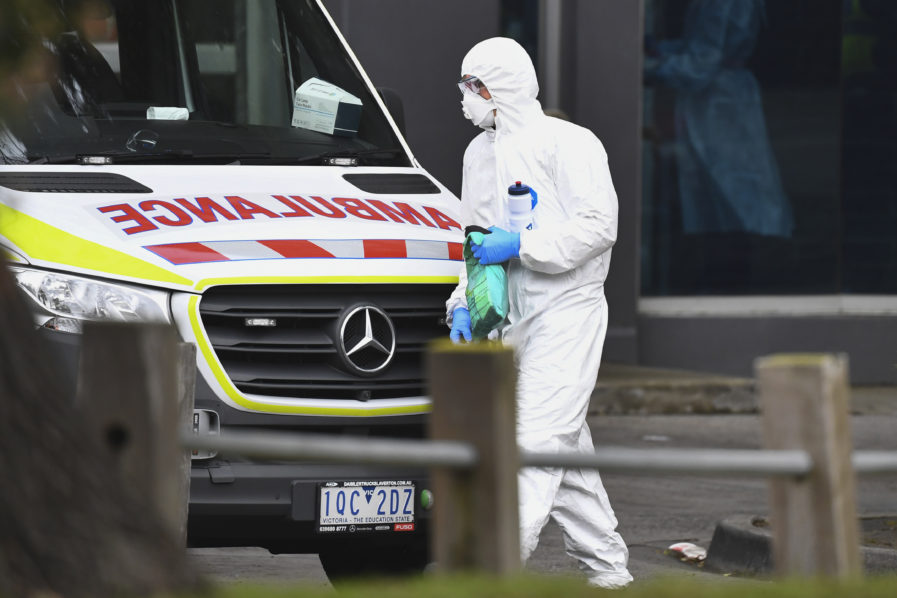 An ambulance is seen outside one of nine public housing estates locked down due to a spike in COVID-19 coronavirus numbers in Melbourne on July 6, 2020. – Australia will effectively seal off the state of Victoria from the rest of the country, authorities said on July 6, announcing unprecedented measures to tackle a worrying surge in coronavirus cases. (Photo by William WEST / AFP)