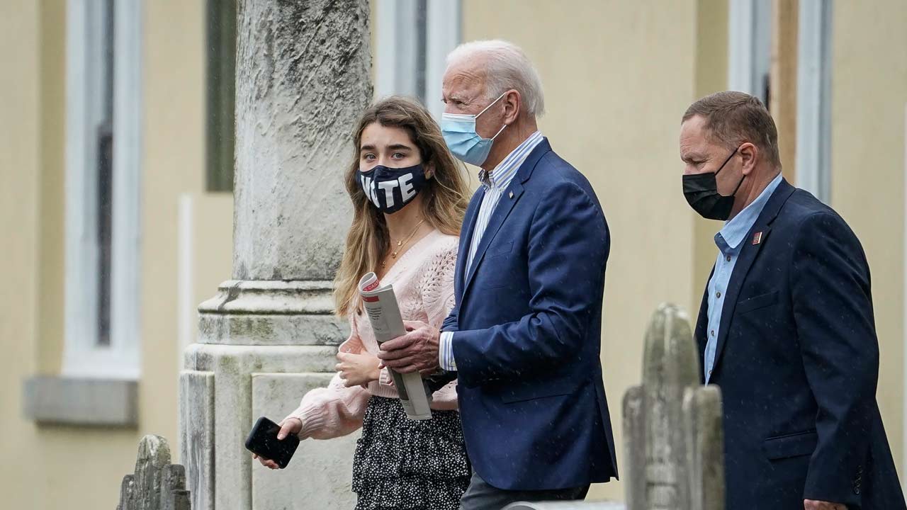 Democratic presidential nominee Joe Biden and granddaughter Natalie Biden leave Sunday mass at St. Joseph on the Brandywine Roman Catholic Church on October 25, 2020 in Wilmington, Delaware. PHOTO: Drew Angerer/Getty Images/AFP Drew Angerer / GETTY IMAGES NORTH AMERICA / Getty Images via AFP
