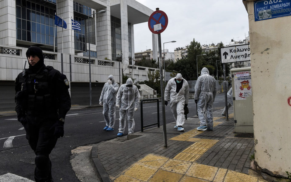 Greek police experts search for evidence after a bomb blast at the Court of Appeal in Athens on December 22, 2017. / AFP PHOTO / ANGELOS TZORTZINIS