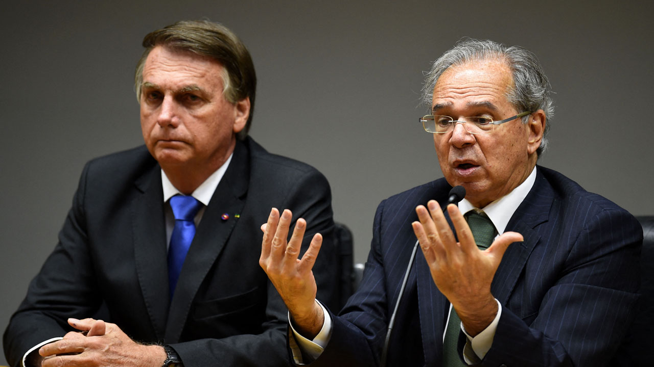 (FILES) In this file photo taken on October 22, 2021 Brazilian President Jair Bolsonaro (L) and his Economy Minister Paulo Guedes (R) are seen during a press conference at the Ministry of Economy headquarters in Brasilia. – Brazil’s economy entered in a recession by going backwards 0,1% in the third trimester of 2021, the second with negative result, due to the impact of the low activity of the agribusiness, the official institute of statistics (IBGE) informed on December 2, 2021. (Photo by EVARISTO SA / AFP)