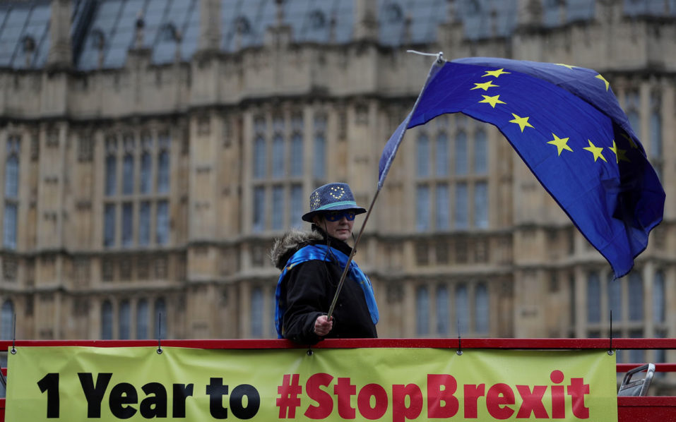Anti-Brexit demonstrators wave European Union flags from the top deck of a bus parked outside the Houses of Parliament in London on March 29, 2018. British Prime Minister Theresa May kick-started divorce proceedings one year ago, and March 29, 2019, has since been set as the date the UK will leave the bloc. / AFP PHOTO / DANIEL LEAL-OLIVAS