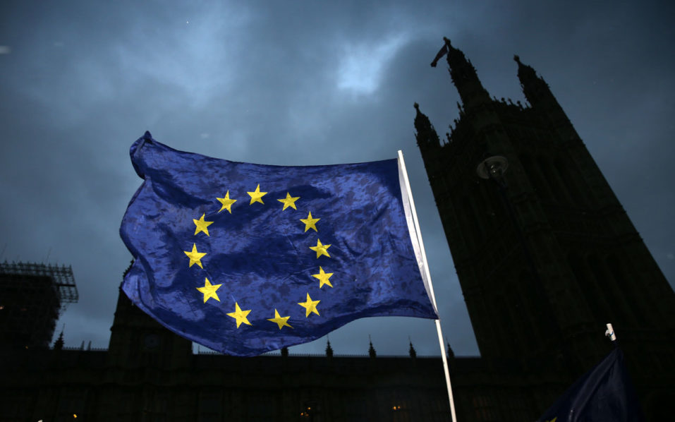 Pro-EU anti-Brexit demonstrators wave an EU flag outside the Houses of Parliament in central London on December 13, 2017 as MPs debate a proposed amendment to the EU Withdrawl Bill. British Prime Minister Theresa May was December 13 facing a rebellion from her own MPs over whether parliament will have a “meaningful vote” on the final Brexit deal in what would be a damaging defeat. / AFP PHOTO / Daniel LEAL-OLIVAS