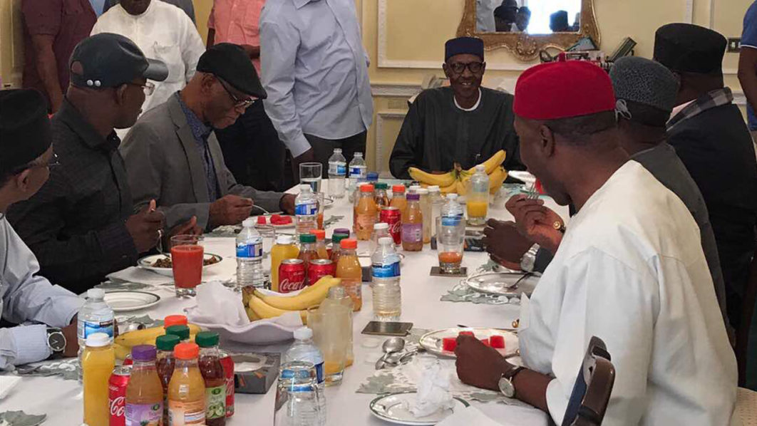 The delegation hosted to lunch included APC’s national chairman John Odigie-Oyegun, Governors Rochas Okorocha (Imo), Nasir El-Rufai (Kaduna), Yahaya Bello (Kogi) and Tanko Al-Makura (Nasarawa), and Minister of Transportation, Chibuike Amaechi.