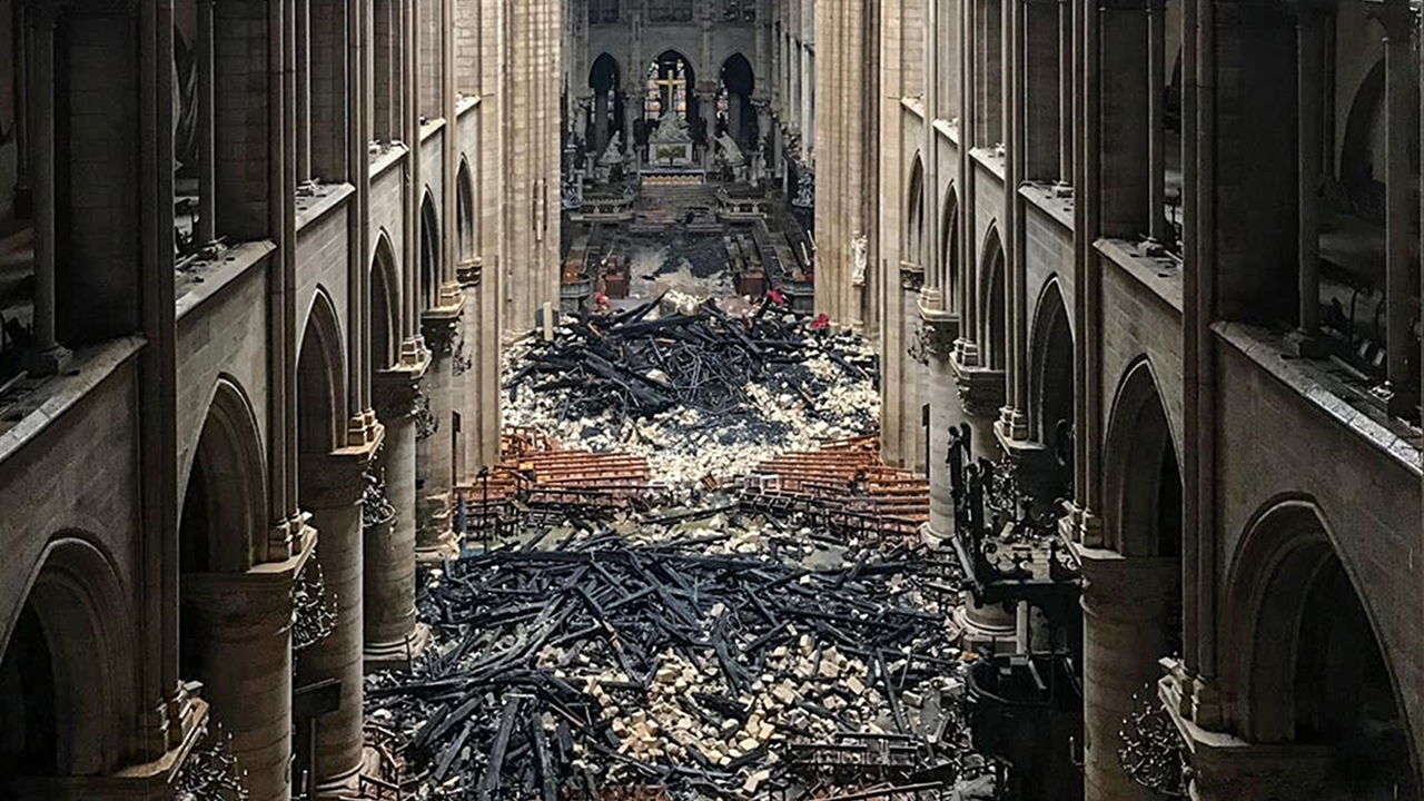 This general view shows debris inside the Notre-Dame-de Paris Cathedral in Paris on April 16, 2019, a day after a fire that devastated the building in the centre of the French capital. - French President Emmanuel Macron vowed on April 16 to rebuild Notre-Dame cathedral "within five years", after a fire which caused major damage to the 850-year-old Paris landmark. (Photo by Amaury BLIN / AFP)