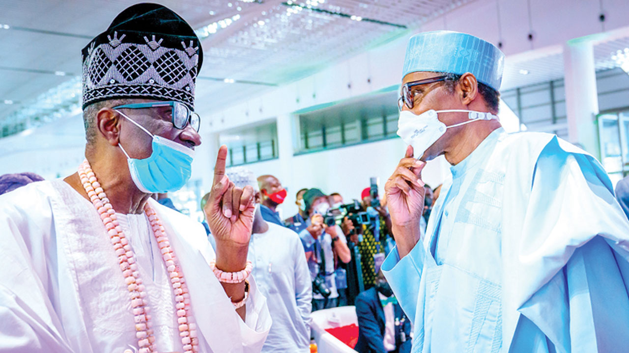President Muhammadu Buhari (right) and Oba of Lagos, Rilwan Akiolu, during the inauguration of Lagos-Ibadan Standard Rail Gauge for commercial operations in Lagos… yesterday.